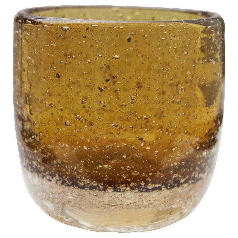 Maple ljuslykta i bärnstensfärgat glas, med små bubblor i sig.